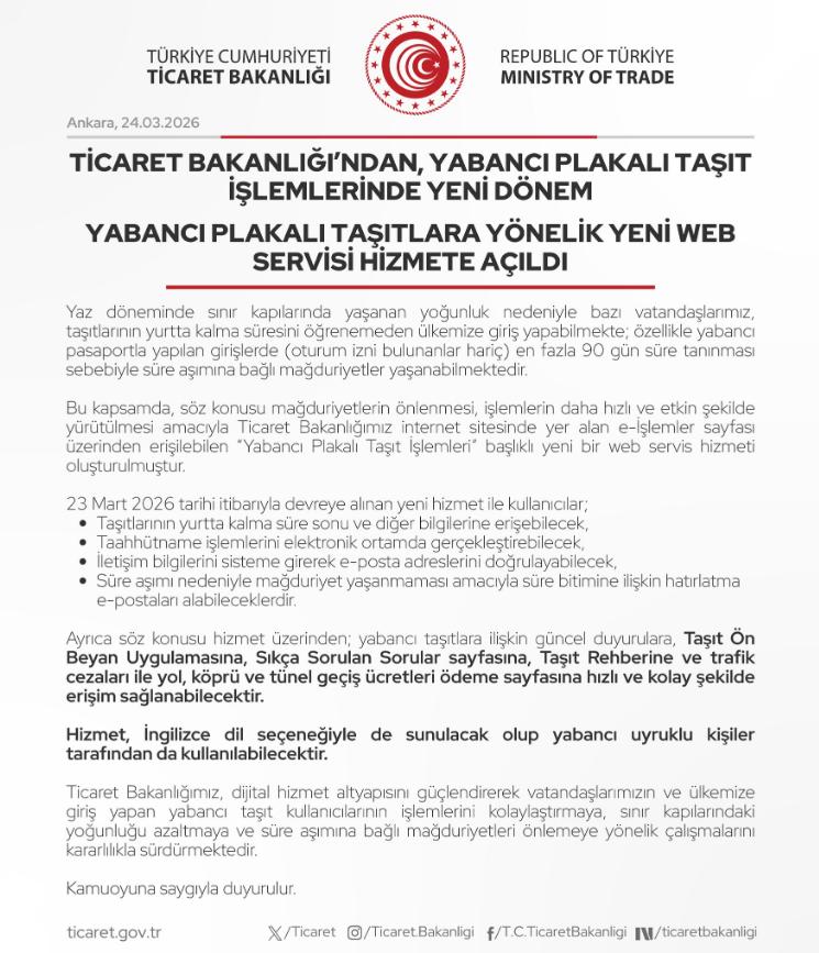 Ticaret Bakanlığı tarafından başlatılan "Yabancı Plakalı Taşıt İşlemleri" hizmetine ilişkin duyuru